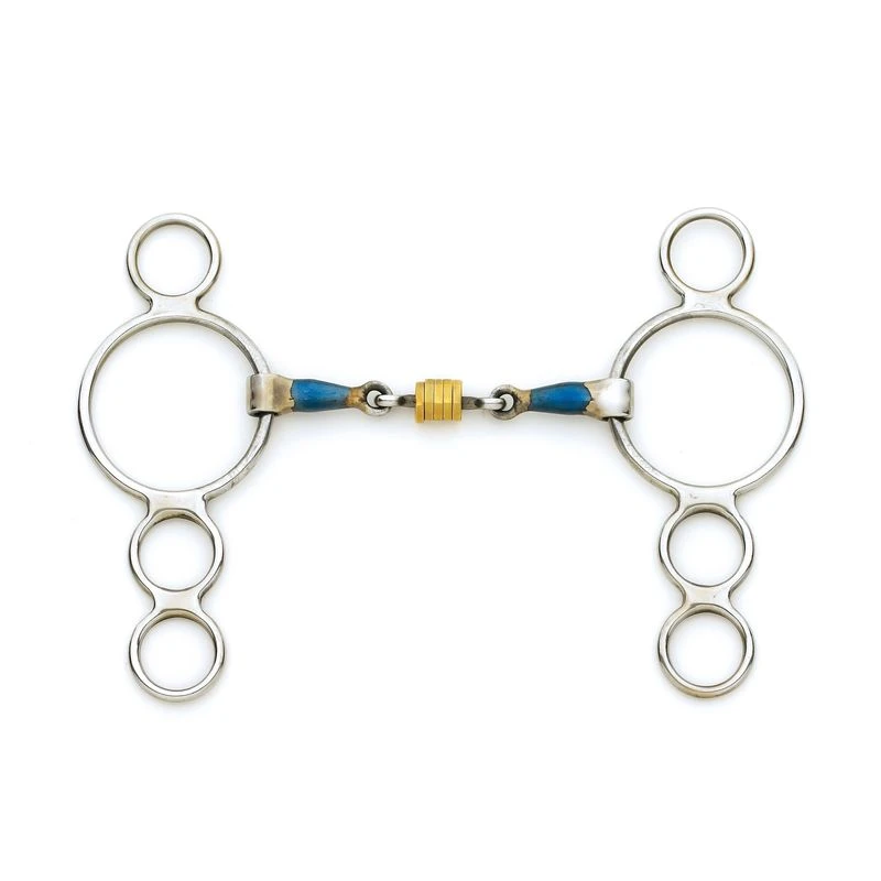 When your horse requires more control, along with a combination of materials to encourage responsiveness, get the Double Jointed Blue Steel Brass Roller Disks 3-Ring Gag from Centaur.