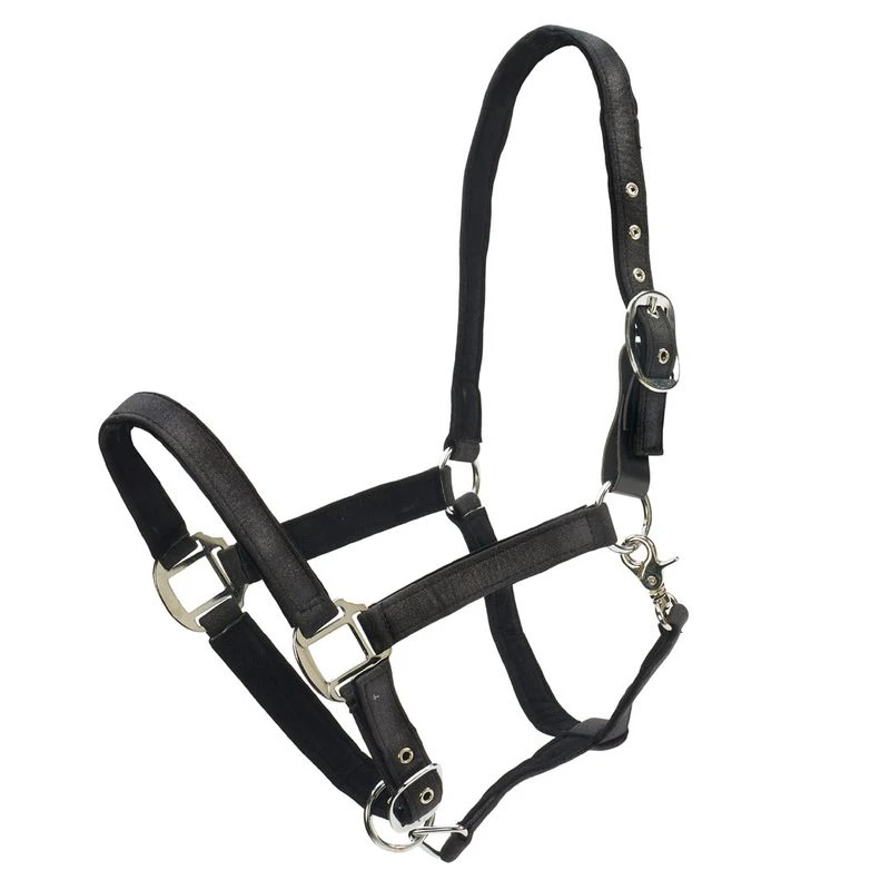 Glitter ribbon halter with velvet-textured lining. Features adjustable chin and crown with scissor snap throat, and breakaway fuse.
