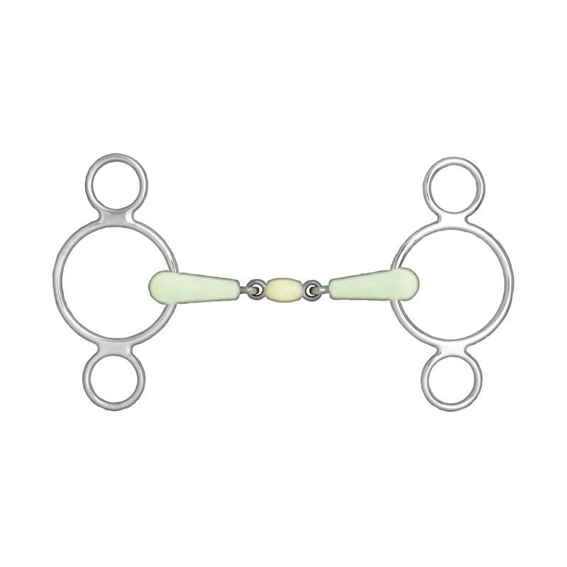Designed to be used with two reins, the cheekpieces are attached to the smaller top ring with the snaffle rein is attached at the mouthpiece and the curb attached at the bottom ring. The peanut style mouthpiece offers less of a nutcracker effect, while the apple flavored polymer encourages the horse to chew and relax their jaw for greater control. May be used with bit guards (sold separately) for extra protection against pinches and rubs.