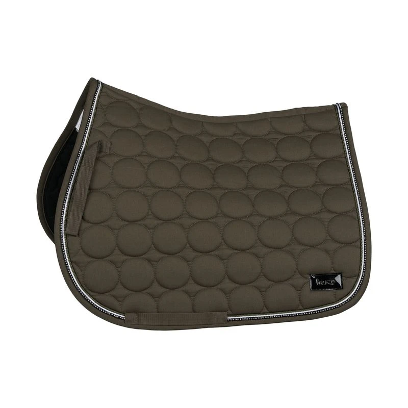 The Horze Marquess saddle pad is made with quick-dry lining that wicks away any moisture. The soft padding ensures a comfortable fit. The trim is decorated with sparkly cord and crystals, giving this all purpose saddle pad a subtle bit of glitter. Pair with the Marquess ear net (#22924) for a full look.