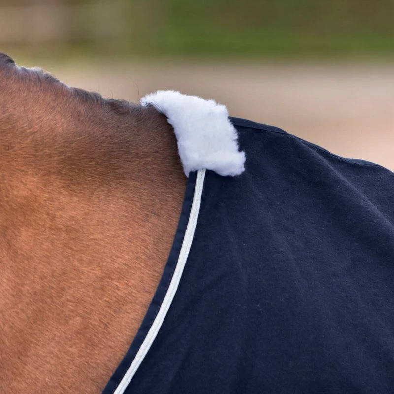 This wool blanket is styled with a heavy corded embellishment on the hip in a classic design that compliments the lovely silver piping and Z logo. A secure fit with low cross surcingles and a double buckle front closure keep this sheet in place. The Millau dress sheet will be your favorite choice for travel as your horse will arrive refreshed and handsome with a clean and shiny coat as he unloads at your next event. Breathable wool means your horse stays warm yet won’t overheat. The durable construction looks delicate but is sturdy, robust, and washes well, lasting season after season.
