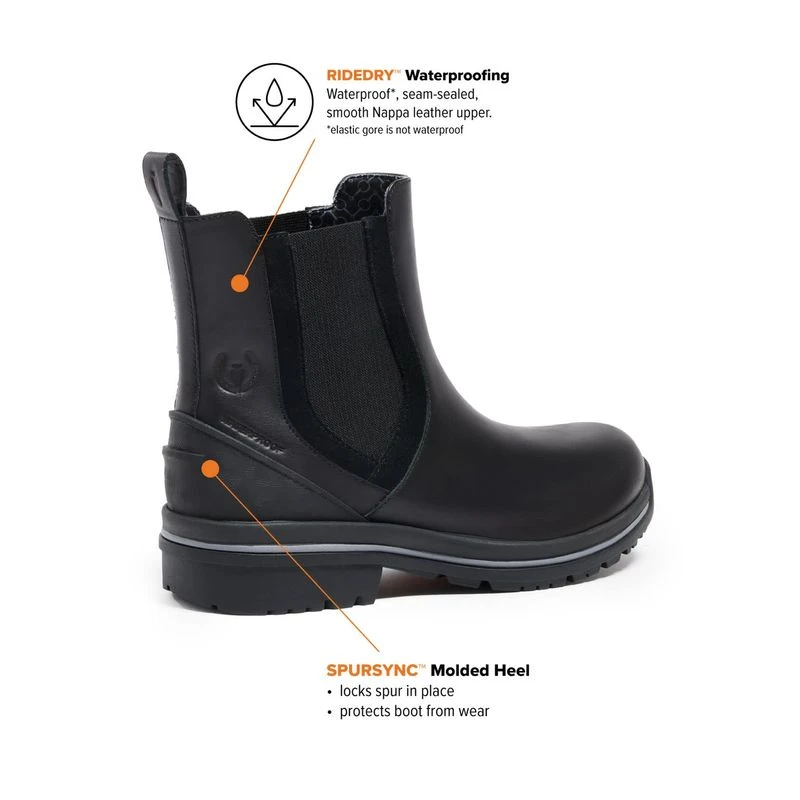 Buttery-soft yet durable Nappa leather with RideDry technology ensures moisture stays out. Dual elastic gore trimmed with eye-catching suede makes for easy on/off and a flexible, ankle-hugging fit. The 6 inch fitted shaft thwarts shavings and hay, while the spacious toe box provides room for wider feet or an extra pair of socks. Removable, anti-microbial insole keeps feet fresh. Rugged, OrangeZone ATO all-terrain outsole handles muddy paddocks with ease, and the 1 inch heel is saddle-ready so you can seamlessly transition from barn tasks to trail rides without changing boots.
