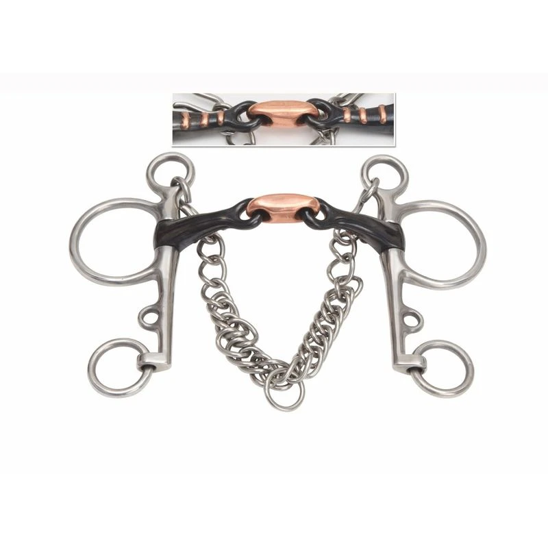 The addition of copper ribs helps prevent the horse from hanging on the bit. A Pelham uses pressure on the poll, corners, bars, tongue .and chin groove. This is a stronger, harsher bit that will assist with control when used with caution. The multi-jointed mouthpiece works to prevent nutcracker action.