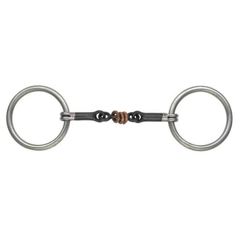 The addition of copper ribs keep the horse from hanging on the bit and is a good deterrent for horses that tend to take hold. The multi-jointed mouth with rollers is good for horses with busy mouths.