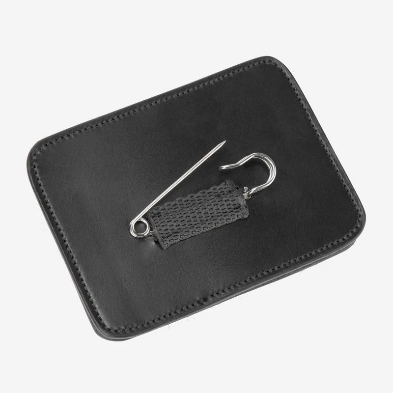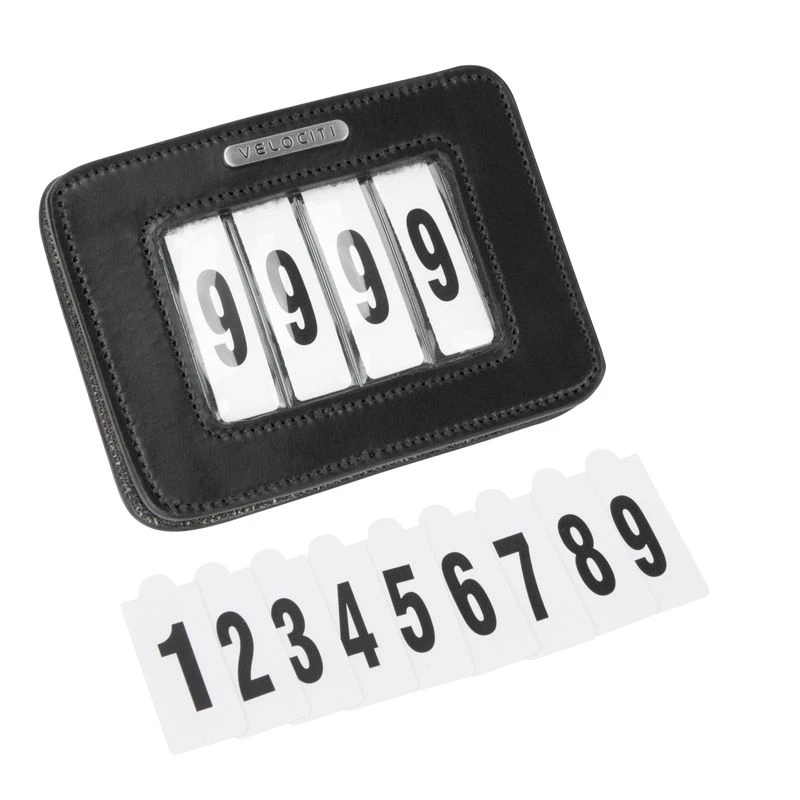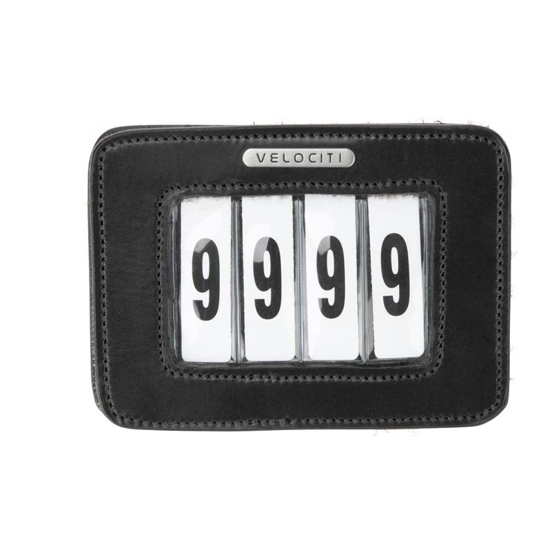 This leather, rectangular holder has a wipe clean slot sleeve, and comes with four sets of numbers 0-9. It has a large safety pin attachment on the back. Dimensions 3″ x 4″.