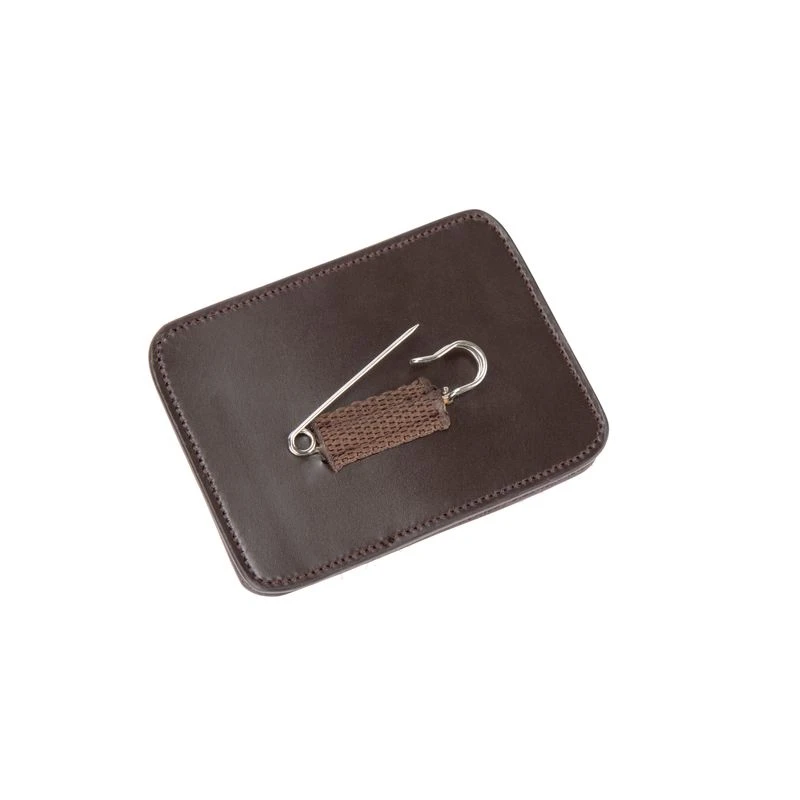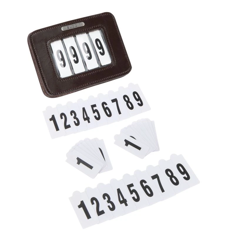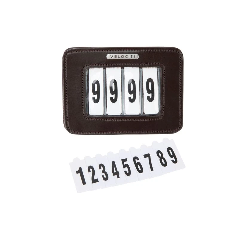 This leather, rectangular holder has a wipe clean slot sleeve, and comes with four sets of numbers 0-9. It has a large safety pin attachment on the back. Dimensions 3″ x 4″.