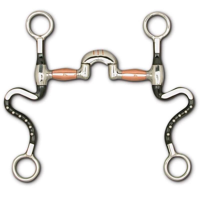 The 7 1/2″ shanks add poll pressure through leverage, with the longer shanks making it a “slower” signal. The low port creates moderate pallet pressure when the bit is fully engaged. The copper segments will encourage salivation.