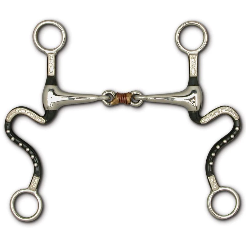 This show bit has 7″ curved shanks in black satin with German silver trim. The mouth has three piece joint with copper wrap.