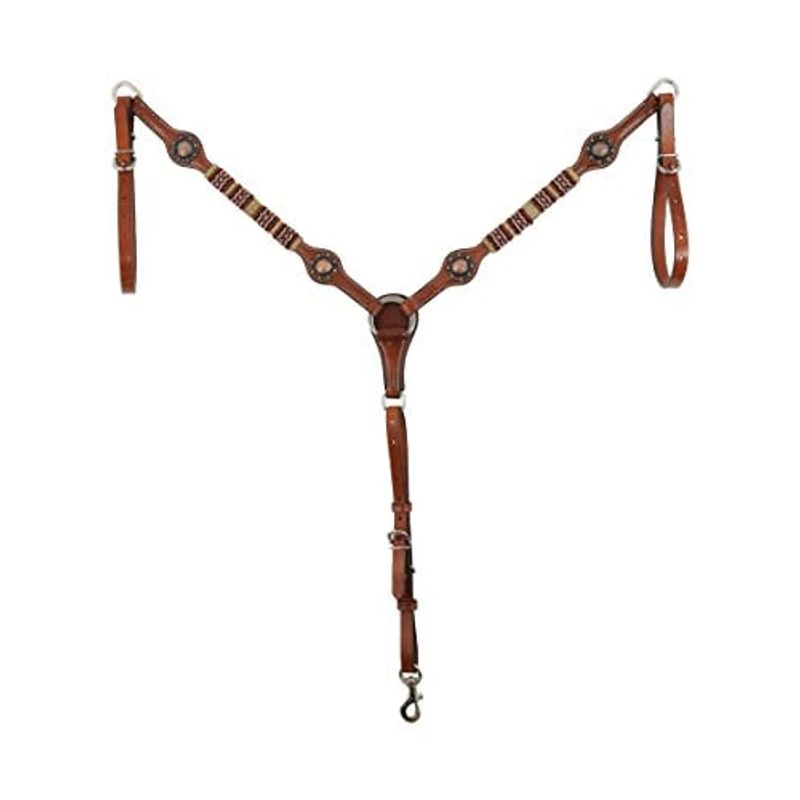 A timeless and classic series, the Western Rawhide Country Legend Rawhide & Red Beads Breastcollar features red and black beading with rawhide accents. This eye catching Western breastcollar, with bronze colored conchos, offers genuine cowboy style.